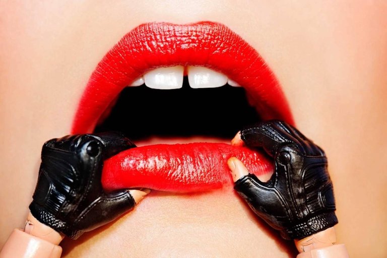 Überdimensionale rote Lippen werden von zwei Händen in schwarzen Lederhandschuhen gepackt.